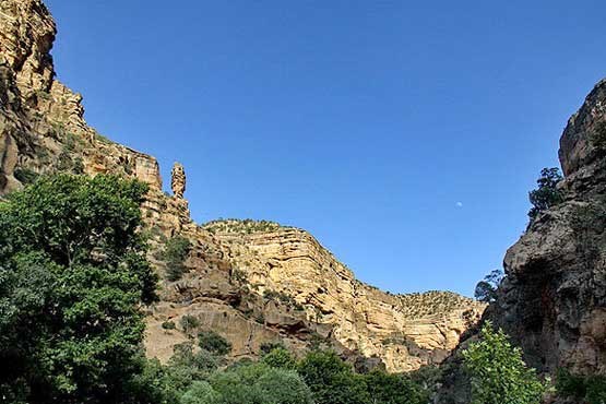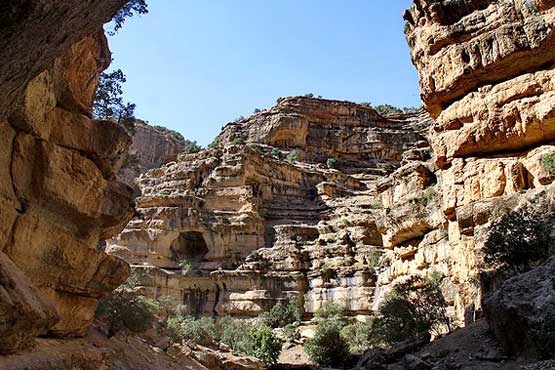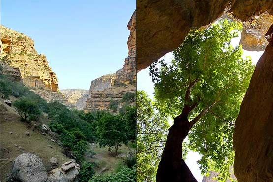 این تنگه که پر است از درختهای کوهی میوه از جمله انگور، انجیر و گلابی درمیان دوکوه شگفت انگیز قرار گرفته است. بر سینه و کمرکش این دو کوه غارهایی زیبا جا گرفته که گویای سکونت بشرغارنشین در این منطقه است.